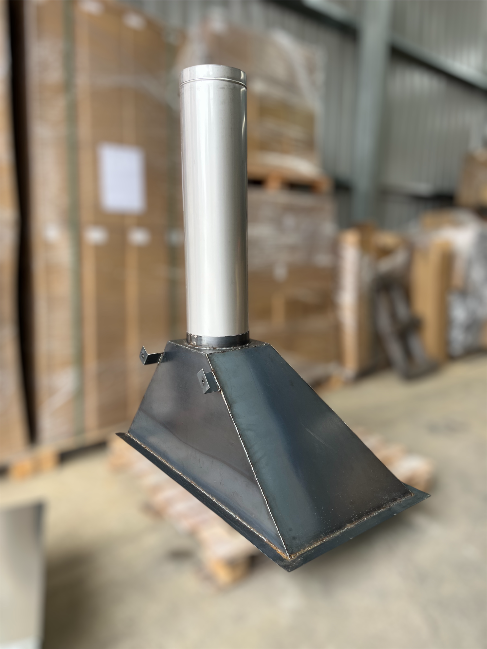 Metal chimney stack on wooden pallet.